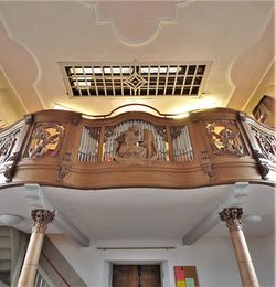 | Geschichte der Orgel: | Die Behler-Orgel wurde 1989 stillgelegt und der originale Spieltisch entsorgt. Zur Gottesdienstbegleitung wurde eine elektronische Orgel angeschafft. Das Pfeifenwerk blieb glücklicherweise unangetastet in der Orgelkammer auf dem Dachboden, was die spätere Reaktivierung erst möglich machte. Im Jahr 2013 wurde das Instrument durch die Firma Freiburger Orgelbau Späth wiederbelebt und bekam einen passenden historischen Spieltisch. Da die ursprünglich pneumatische Traktur ohnehin nicht mehr vollständig vorhanden war, entschied man sich die Orgel zu elektrifizieren. |