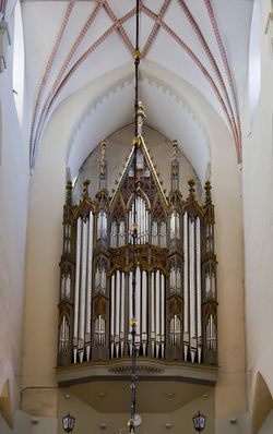 | Geschichte der Orgel: | Die 1842 erbaute Walcker-Orgel sollte 1914 auf 77 Register erweitert und auf den damaligen Stand der Technik (Pneumatik) gebracht werden. Dazu wurde sie aus Tallinn in die Werkstätte Walckers gebracht; zum Wiederaufbau kam es durch den Beginn des Ersten Weltkrieges aber nur teilweise;[1] Die Pfeifen des ganzen I. Manuals und weiterer Register fehlen bis heute. In den letzten Jahren konnten aber immer wieder einzelne Stimmen aus verschiedenen Beständen aufgetrieben und ergänzt werden. |