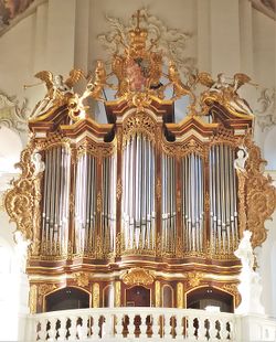 | Gehäuse: | Historisches, von Balthasar Neumann entworfenes Gehäuse der Vorgängerorgel aus den Jahren 1747-1756, die von Romanus Benedikt Nollet erbaut worden war. |