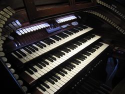 Lieblich Gedeckt 16' Prinzipal 8' Schwiegel 8' Konzertflöte 8' Zartflöte 8' Gedackt 8' Salizional 8' Oktave 4' Rohrflöte 4' Gemshorn 4' Nasard 2 2/3' Oktave 2' Terz 1 3/5' Flageolett 1' Cornett 3f [4], 2 2/3' Mixtur 4f 1 1/3' Englisch Horn 8' Tuba 8' Vox humana 8' [5] Tremulant [6] |