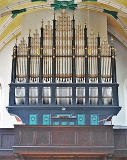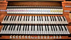 | Spielhilfen, Koppeln: | II/I, II/I (Sub), II/I (Super), II/II (Super), I/P, II/P, II/P (Super), Leerlaufkoppel I, Generalkoppel, Piano, Mezzoforte, Fortissimo, Pedalpiano, Registercrescendotritt, Handregister zum Registercrescendo, Zungen Ab |