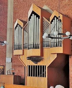 | Spielhilfen, Koppeln: | II/I, I/P, II/P, Sub-Pedal, Zungenabsteller, 16'-Absteller für das Manual, Registerschweller, freie und feste Kombinationen |
