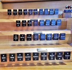 | Spielhilfen, Koppeln: | I/II, IIII/II, III/I, I/P, II/P, III/P, „Alle Koppeln“ (als Tritt), 2 freie Pedalkombinationen, keine Kombinationen für die Manuale! |