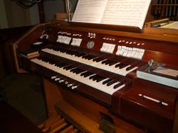 | Spielhilfen, Koppeln: | II-I, II-I (Sub), I-P, II-P, Koppeln beim Crescendo aus, Crescendo aus, Handregistrierung, Freie Kombination, Tutti, Absteller für Fagott, Schalmei Trompete und II-I (Sub) |