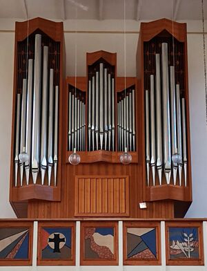 Gehäuse: Das Orgelgehäuse in Kiefer wurde von der Tischlerei Schulze angefertigt.