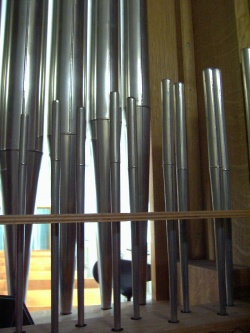Umbauten: 1993/94: Roland Martschei/Gunther Böhm (Dresden) - neues Orgelgehäuse und 2 neue Register, Umsetzung im Kirchenraum