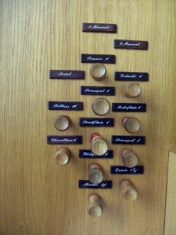 Registeranzahl: 11 Zug – Register (hellbraune, schlanke Manubrien/ dunkle Holzschilder/ helle Schrift)