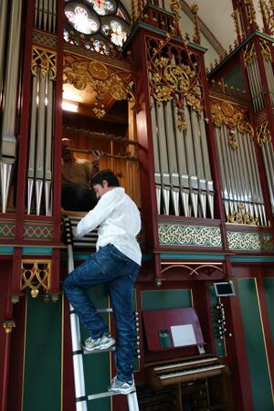 | Spielhilfen, Koppeln: | Normalkoppeln, wechselwirkend mit Zügen und Tritten: II-I, II-P, I-Pedalwechseltritte für Mixturen und Zungen an / ab; 4fache, rein mechanische Setzanlage |