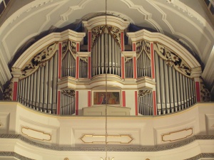 | Windladen: | 5 Schleifladen (2 Hauptwerks-/ 2 Pedal-/ 1 Oberwerkslade), Winddruck 65 mmWS |