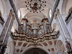 Die große Orgel der Warthaer Wallfahrtskirche wird zu den über Schlesien hinaus bedeutsamen Werken gezählt. Es handelt sich um eine Rokokoorgel. Sie war ein Geschenk vom Kloster Kamenz. Der Vertrag über den Orgelbau wurde 1755 geschlossen. 1759 wurde die Orgel fertiggestellt. Der Orgelprospekt stammt vom Warthauer Holzbildhauer Heinrich Hartmann. Entsprechend der breiten Ausrüstung des Orgelwerkes ist auch in den dekorativen Schnitzereien die Horizontale durch mehrere Gesimse an der Brüstung der Empore und am Unterbau des Orgelwerkes betont. Die ein- und ausschwingenden Flächen sind mit Muschel- und Rankenwerk besetzt. Über den Orgelpfeiffen belebt ein Engelsorchester, dessen zahlreiche Figuren vor und über dem kräftigen Gesims plaziert sind, den Prospekt. In der Mittelachse befindet sich eine Skulpturengruppe der Anbetung der Hl. Dreifaltigkeit.