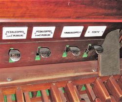 | Spielhilfen, Koppeln: | II/I, I/P, II/P und eine feste Kombination „Forte“ (=Tutti), als Einhaktritte |
