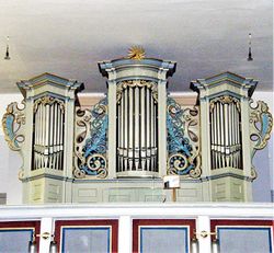 Principal 8' Flûte harmonique 8' Viola da Gamba 8' Octave 4' Quinte 22/3' Superoctave 2' Terz 13/5' Mixtur 4f 11/3' Trompete 8' Tremulant |