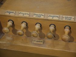 Principal 4' (B/D) Rohrflöte 4' (B) Sesquialter 2-fach (D) Waldflöte 2' (B/D) Scharff 3-fach (B/D) |