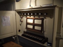 | Spielhilfen, Koppeln: | Pedalkoppel (nachträglich eingebaut), Manual-Transposition: durch Verschieben der Klaviatur in drei Halbton-Schritten kann bis zur Normalstimmung 440 Hz nach unten transponiert werden. |