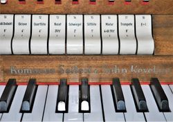 | Spielhilfen, Koppeln: | II/I, I/P, II/P, 2 freie Kombinationen, Plenum, Crescendo-Walze |