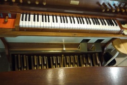 | Spielhilfen, Koppeln: | Pedal-Koppel (als Fußraste), 2 Schweller-Tritte betätigen Schranktüren für Diskant-(=Ober-) und Bass-Werk (letztere sind aus praktischen Gründen z.Zt. entfernt) |