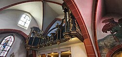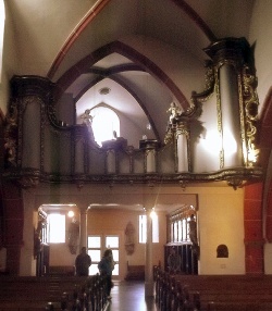 Geschichte der Orgel: Im Zuge einer Kirchenrenovierung 1999 wurde ein Großteil der Orgel, die sich in schlechtem Zustand befand, ausgebaut. Zunächst (ab 1999) verblieben noch das Schwellwerk und ein Pedalregister spielfähig, diese sind aber in den 2010er Jahren abgebaut worden; die Begleitung des Gottesdienstes erfolgt derzeit an einem Flügel, der unter der Empore positioniert ist. Das historische Orgelgehäuse in der Brüstung selbst war bereits ab 1999 leer.