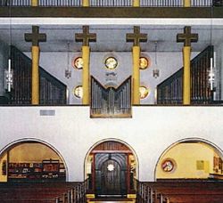 | Geschichte der Orgel: | Die Orgel wurde ursprünglich für das Redemptoristenkloster Heiligenborn in Bous (Saarland/Deutschland) erbaut. 2012 nach der Schließung des Klosters wurde die Orgel nach Polen an die Gemeinde P.W. Matki Boskiej Rozancowej (Rosenkranzkönigin) in Jawor (Niederschlesien) verkauft. Beim Einbau in die Kirche wurde das Rückpositiv über dem Spieltisch quasi als Ober- bzw. Brustwerk wieder aufgebaut. |