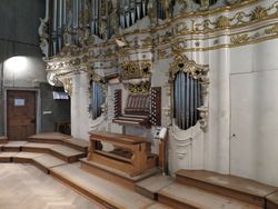 Gehäuse: Das Orgelgehäuse wurde 1758 durch den Brixener Zimmermann Ferdinand Schwabl angefertigt, die dazugehörige Orgel wurde 1756-58 durch Augustin Simnacher und Alexander Holzhey errichtet.