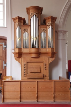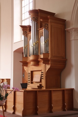 | Temperatur (Stimmung): | Im HW mitteltönig, im UW nach Valotti. Die Töne Dis/Es und Gis/As können jeweils durch einen Registerzug mit dem entsprechenden Ton belegt werden. Wirkung auf das gesamte Werk. |