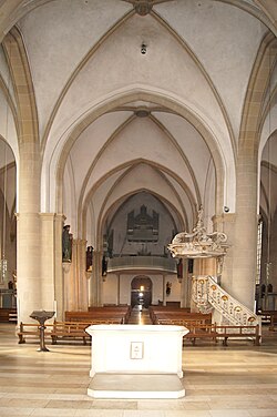 | Gehäuse: | Die Orgel befindet sich in drei separaten Gehäusen. Vom Mittelschiff aus zu sehen ist nur das relativ kleine Oberwerk (II), welches an der Rückwand des Kirchenschiffs über der Empore hängt. Die ürbigen Werke verteilen sich auf zwei erheblich Größere Gehäuse links und rechts der Empore. |