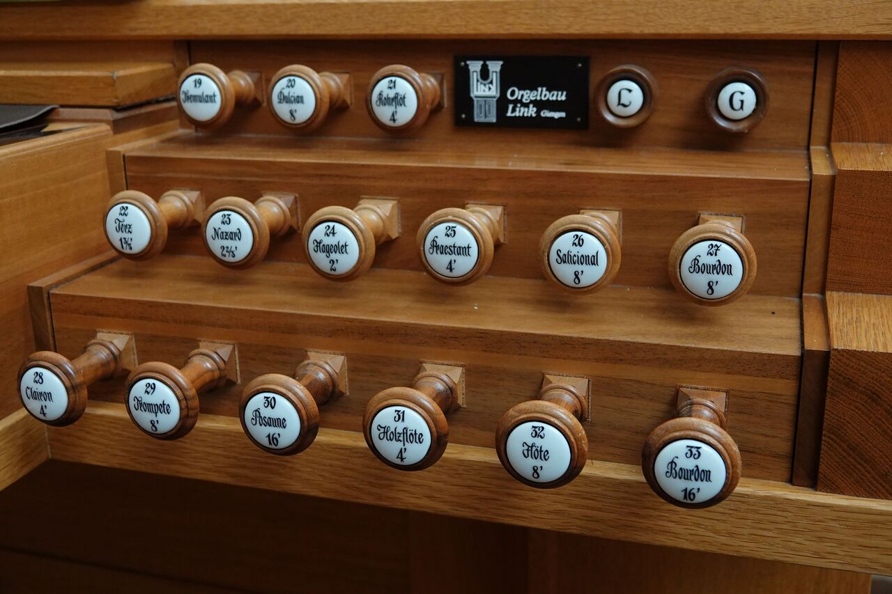 Link-Orgel in der Basilika St. Michael, Altenstadt - Spieltischdetail Datum 2019 Autor bzw. Rechteinhaber Johannes Jais (mit freundlicher Genehmigung) Quelle Eigenes Werk Lizenz Standard-Lizenz von Organ index siehe Organ index:Urheberrechte