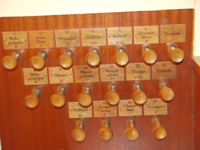 | aktuell | 12:33, 29. Okt. 2013 | 2.816 × 2.112 (1,96 MB) | Reicwo (Diskussion | Beiträge) | {{Dateiinfo |Beschreibung = Berlin-Weißensee, Pfarrkirche, Sauer-Orgel, Register |Datum = 05.09.2013 |Autor = Wolfgang Reich |Quelle = Eigene Aufnahme |Lizenz = }} |