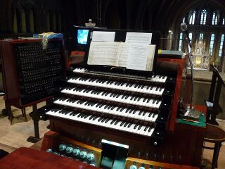 Budapest, Matthiaskirche, Spieltisch Hauptorgel. Quelle: Wikipedia