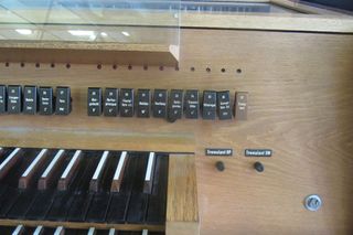 Düsseldorf-Golzheim, Robert-Schumann-Hochschule, Hauptgeböude Fischerstraße 110, Raum E.01, Winfreid Albiez, Lindau, 1981; Registerzüge Hauptwerk, Schwellwerk