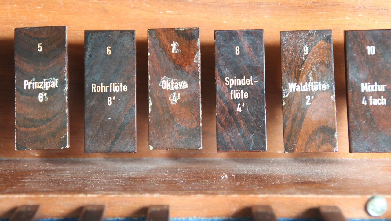 | Beschreibung | Manubrien der Hauptwerksregister der Hardt-Orgel der evangelischen Kirche Hochelheim zu Hüttenberg |