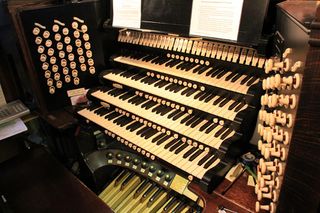 | Beschreibung | Spieltisch der Willis-Orgel in Hereford |