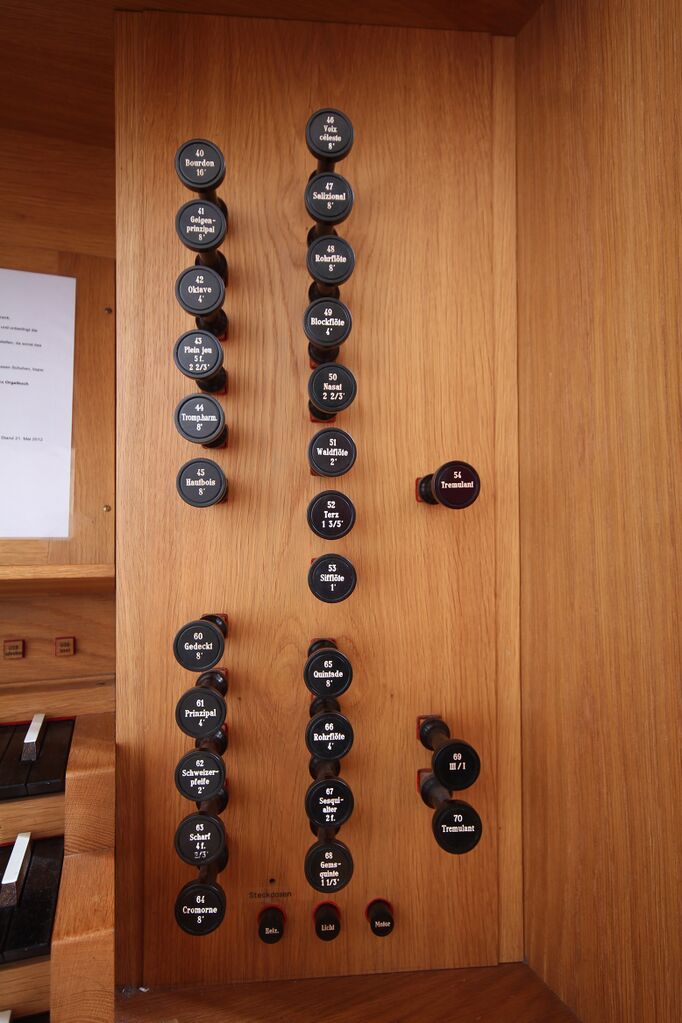 | Beschreibung | Rechte Registerstaffel der Weigle-Orgel der Ev. Stephanuskirche zu Leinfelden-Echterdingen/Echterdingen |