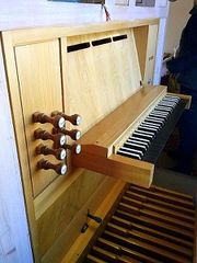 | Beschreibung | Spieltisch der Mayer-Orgel der Protestantischen Kirche Mörlheim |