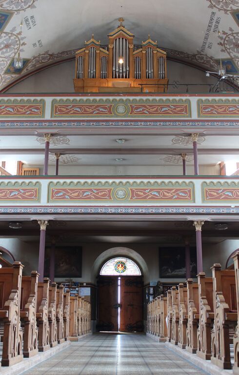| Beschreibung | Behmann-Orgel der Pfarrkirche Mariä Opferung zu Mittelberg-Riezlern (Kleinwalsertal) - Kirchenschiff mit Orgel |
