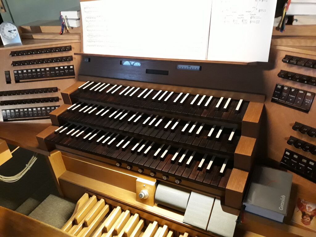 Beschreibung: Spieltisch der Fischer und Krämer Orgel in Niederselters