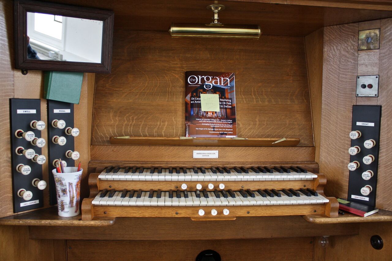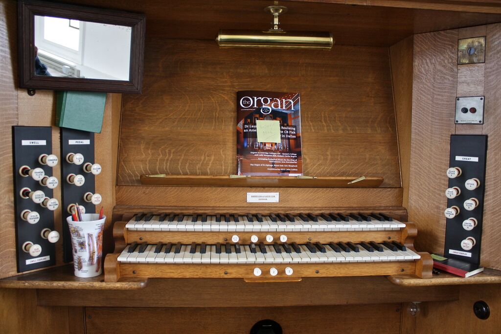 | Beschreibung | Spieltisch der Harrison-Orgel |