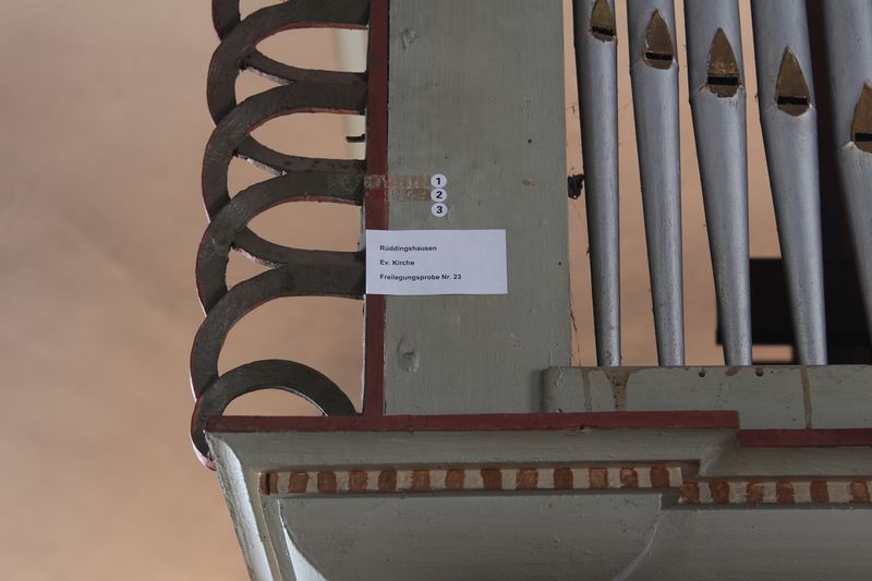 | Beschreibung | Link-Orgel der ev. Kirche zu Rabenau-Rüddingshausen, Gehäuse von einem anonymen Orgelbauer aus dem Jahr 1804, Farbproben am Gehäuse 2 |