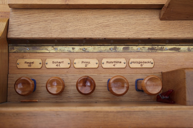 | Beschreibung | Registerzüge an der linken Seite der Orgel der ev. Kirche zu Reiskirchen-Lindenstruth |