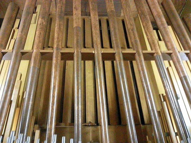 | Beschreibung | Blick von vorne auf die Bombarde 16' (HW) der Klais-Orgel in Christkönig Saarbrücken. Dahinter sind die beiden Schwellwerke übereinander angeordnet (oben SW1, unten SW2) |
