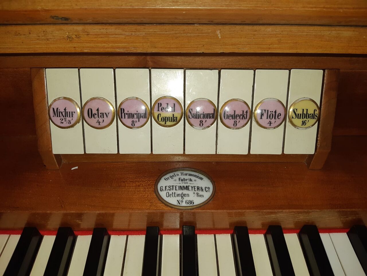 Steinmeyer-Orgel in der Pfarrkirche St. Martin, Sachsenried - Registerwippen Datum 2019 Autor bzw. Rechteinhaber Anna Scholz (mit freundlicher Genehmigung) Quelle Eigenes Werk Lizenz Standard-Lizenz von Organ index siehe Organ index:Urheberrechte
