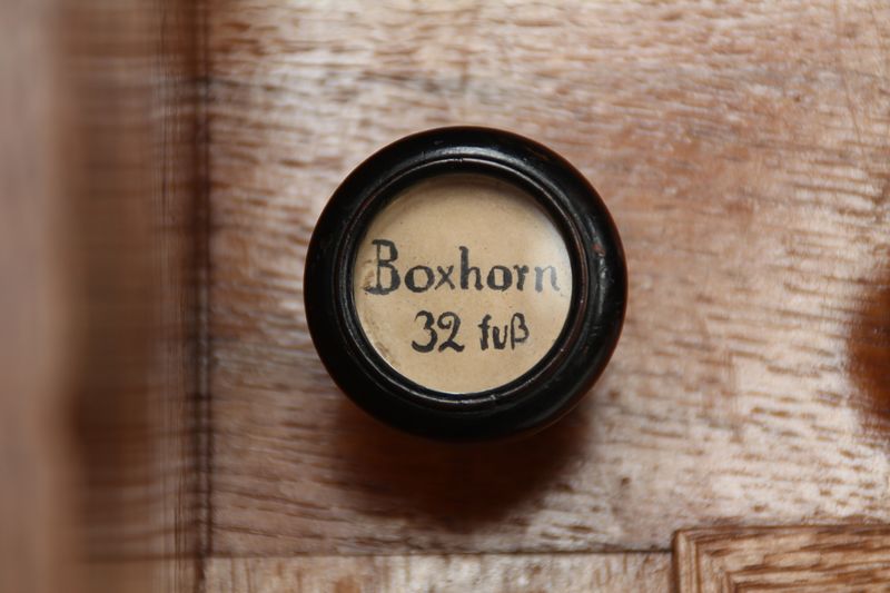 | Beschreibung | Manubriu "Boxhorn 32'" an der Weil-Orgel der evangelischen Bergkirche zu Waldböckelheim |