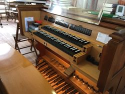 Schwelltritt Spielhilfen 2006: 5-facher Setzer, Tutti (Knopf und Fußtritt); Auslöser; Absteller: Mixturen ab, Zungen ab |