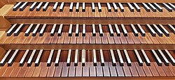 - ↑ Die Holzflöte 8' ist nicht abschaltbar dem III. Manual als Begleitregister zugeordnet. Sie dient zudem als Transmissionsregister für das Pedal. Die Bauart ändert sich über den Manualverlauf hinweg von Gedeckt im Bass zu Rohrflöte in der Manualmitte bis hin zur offen im Diskant.