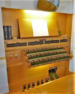 | Spielhilfen, Koppeln: | II/I, III/I, III/II, I/P, II/P, III/P, 256-fache Setzeranlage, Registercrescendotritt |