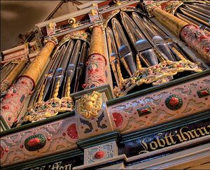 Planlose Umbauten seit 1920 hatten das Instrument zerstört. Von 1997 bis 2009 verwirklichte der international renommierte Orgelbauer Gerald Woehl aus Marburg hier ein ehrgeiziges Projekt. Weltweit erstmals entstanden hinter dem in ursprünglicher Farbigkeit restaurierten Prospekt zwei Stilinstrumente: Im historischen Gehäuse als unverzichtbares Erbe die Klanggestalt der Schnitgerorgel (1709) mit deren spezifischen Wesensmerkmalen, mit alter, mitteltöniger Stimmung und lebendiger, gleichsam »atmender« Windversorgung aus drei traditionellen Keilbälgen, was eine authentische Wiedergabe der Musik des norddeutschen Barock ermöglicht. Der Spieltisch (drei Manuale und Pedal) befindet sich am Hauptgehäuse auf der alten Orgelmpore. Dahinter steht eine symphonische Orgel mit den Merkmalen großer romantischer Orgeln, mit moderner, gleichstufiger Stimmung. Deren »Lunge« besteht aus 8 Magazinbälgen, die das große Instrument mit dem nötigen Wind versorgen und es ermöglichen, dass die Orgel vom zartesten Pianissimo bis zum grandiosen symphonischen Tutti mit homogener und Melodie betonender Klanglichkeit erklingt. Diese zweite Orgel besitzt einen eigenen, freistehenden Spieltisch (vier Manuale/Pedal) auf der unter der Orgelempore liegenden Sängerempore. Seit ihrer Fertigstellung besitzt Sankt Nikolai nicht nur wieder die größte Orgel des Landesteils Schleswig, sondern ein auch in seiner Art einzigartiges Instrument: Zu sehen der als nationales Kulturdenkmal eingestufte Prospekt aus der Renaissance. Zu hören sind eine große norddeutsche Barockorgel nach dem Vorbild Schnitgers und ein symphonisch-romantisches Instrument, inklusive Fernwerk auf dem Dachboden über dem Altarraum. So spiegelt diese Orgel in ihrer Gesamtheit, mit ihrer einzigartigen Verbindung von historischem Erbe und moderner Neugestaltung, selbst die bewegte Orgelgeschichte der letzten 400 Jahre an Sankt Nikolai wider. (Text: KMD Michael Mages, Organist und Kantor an St. Nikolai, Bilder: Bernhard Hüper, Thomas Bornemann) |