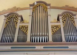 | Spielhilfen, Koppeln: | Baß Tutti (Pedalkoppel für Hauptwerk+Positiv), Manual Tutti (Manualkoppel) |