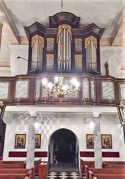 | Umbauten: | - 1970 Neues Gehäuse durch Seifert und Umstellung der ehemals an der Wand hängenden Windladen in dieses Gehäuse, bzw. in den Turmraum der Kirche