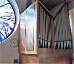 | Umbauten: | Zu einem späteren Zeitpunkt wurden drei Suboktavkoppeln eingebaut; 2018 wurde die Orgel durch die Firma Münchner Orgelbau Johannes Führer gereinigt, etwas umdisponiert und die Intonation grundlegend überarbeitet. |