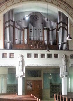 | Spielhilfen, Koppeln: | II/I, II/I (Sub), II/I (Super), II/P, P/P (Super), 1 freie Kombination, Piano, Mezzofort, Forte, Fortefortissimo, Tutti, Registercrescendo (als Tritt und Handhebel) |