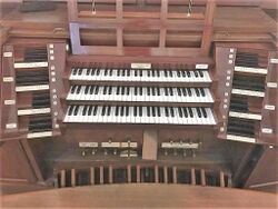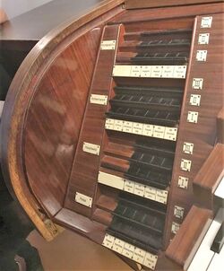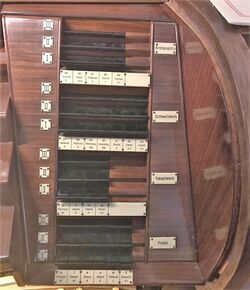 | Spielhilfen, Koppeln: | II/I, II/P, 2 freie Kombinationen (wobei die zweite werksweise getrennt schaltbar ist), Einführungstritt, für die feminine und die maskuline Registergruppe, Auslösungstritte für jede der genannten Funktionen |